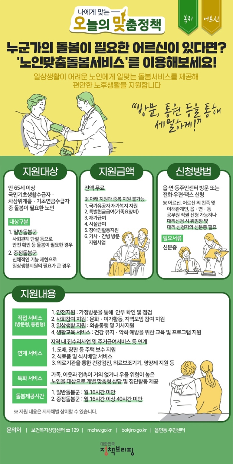 일상생활이 어려우신 어르신들을 대상으로 맞춤형 돌봄서비스를 제공합니다.