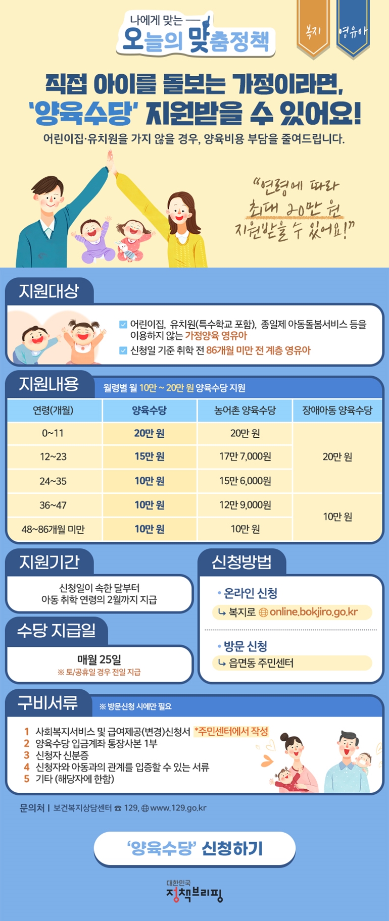어린이집, 유치원 등을 이용하지 않고 직접 아이를 돌보는 가정에 양육수당을 지원합니다.