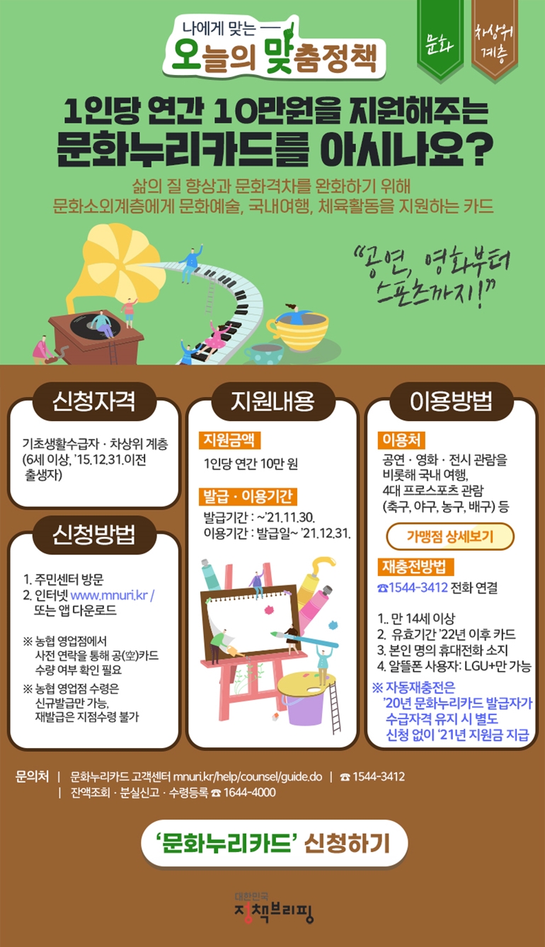 문화누리카드를 통해 1인당 연간 10만원을 지원받을 수 있습니다.