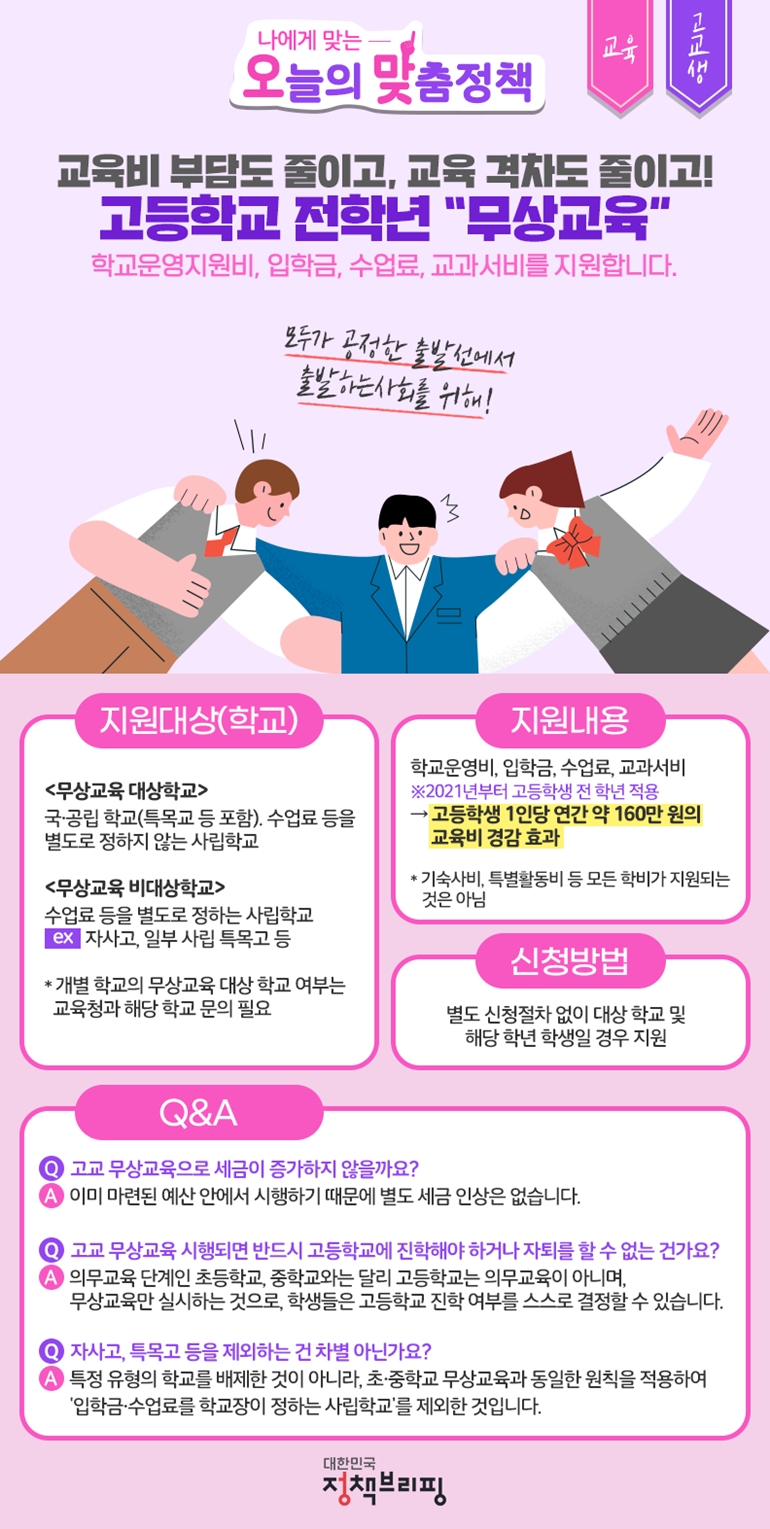 2021년부터 고등학생 전 학년 대상으로 무상교육(학교운영비, 입학금, 수업료, 교과서비)을 실시합니다.