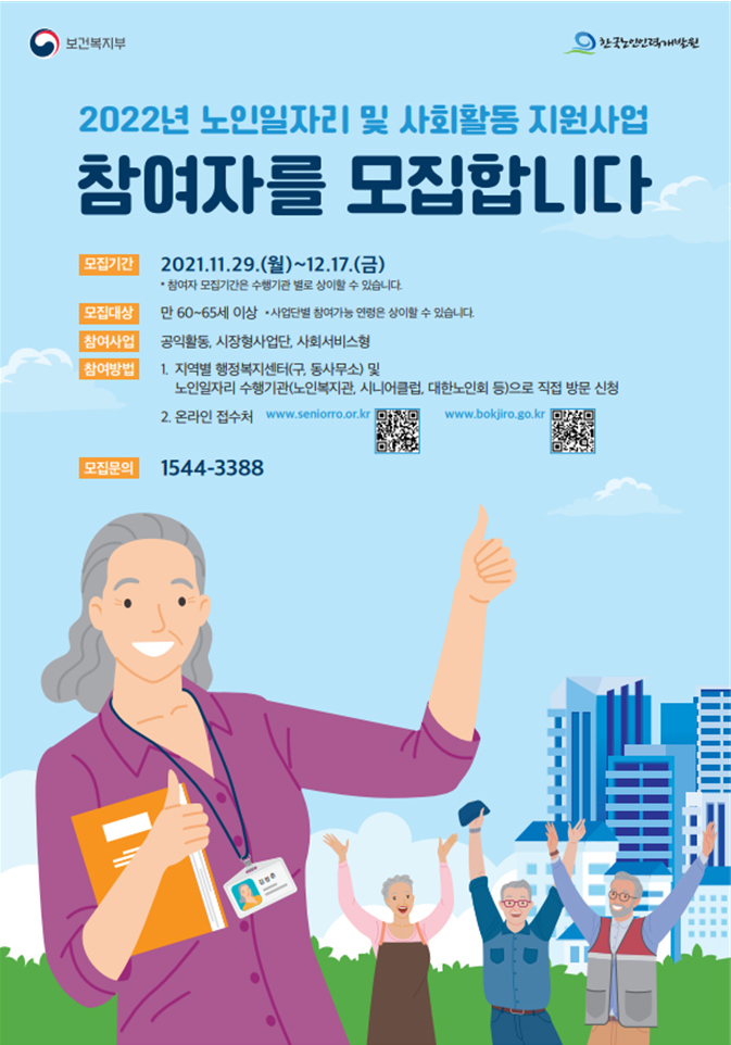 2022년 노인일자리 및 사회활동 지원 사업 참여자를 모집합니다.