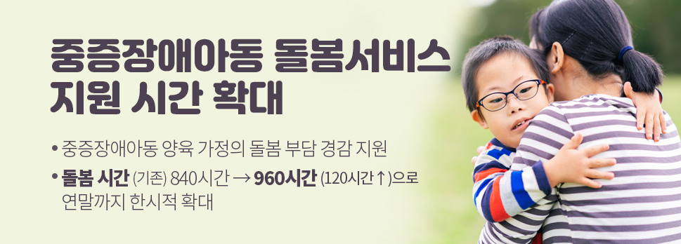 □ 보건복지부는 중증장애아동 가족에 대한 돌봄 부담을 경감하기 위해 올해 연말까지 ‘장애아가족 양육지원 사업’의 정부 지원 돌봄 시간을 연간 960시간까지 한시적으로 확대할 계획이라고 밝혔습니다.