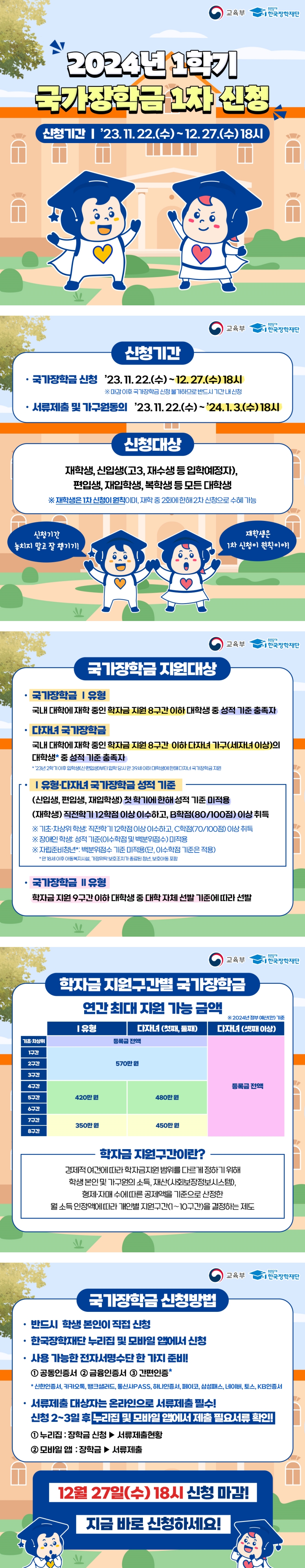 2024년 1학기 1차 국가장학금 신청을 안내합니다.