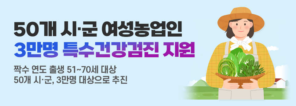 여성농업인 특수건강검진은 여성농업인에게 농작업으로 인해 자주 발생하는 질병을 예방하기 위한 검진으로 근골격계, 심혈관계, 골절·손상위험도, 폐기능, 농약중독 총 5개 영역 10개 항목에 대해 2년 주기로 검진한다. 더불어, 농작업성 질환의 조기 진단과 사후관리·예방 교육 그리고 전문의 상담도 제공하며, 검진비용의 90%를 지원한다.