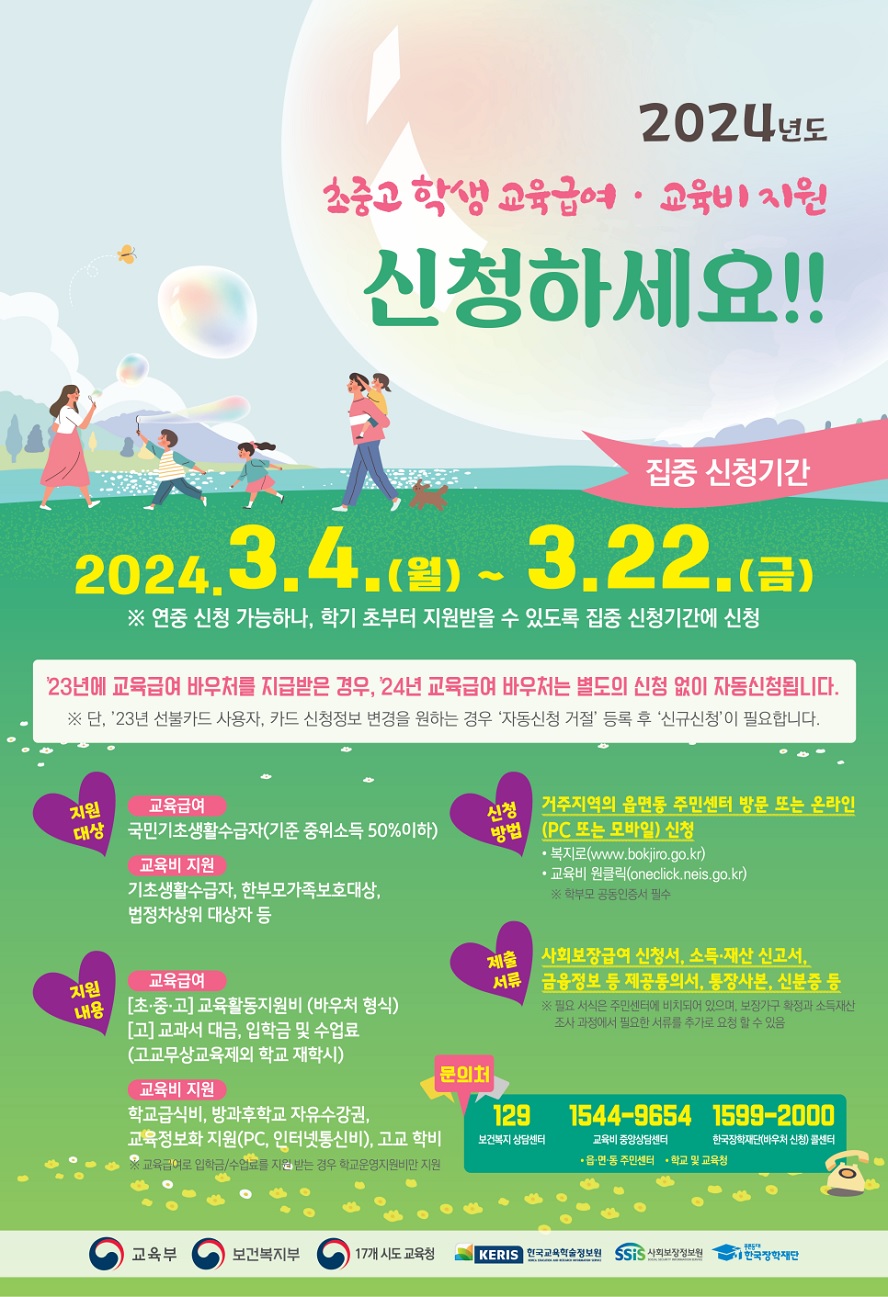 2024년도 초중고 학생 교육급여·교육비 지원 신청하세요!