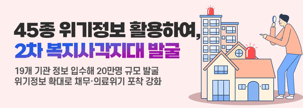 이번 발굴에서는 위기가구 발굴에 활용되는 위기정보로 국민연금공단의 노후 긴급자금 대부 대상자를 새로 추가하여 기존 44종에서 45종으로 확대하였다. 그리고 현재 입수 중인 금융연체자 정보를 연체금액 외에 채무액도 추가하고, 의료위기 정보 2종*의 대상자 범위를 확대하여 채무·의료위기에 대해 좀 더 폭넓게 발굴할 수 있게 되었다.