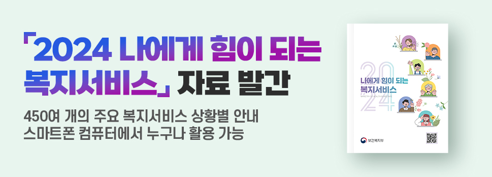 정부 부처에서 다양한 복지서비스를 제공하고 있으나, 그 종류가 많고 신청 방법 등이 제각기 달라 국민들이 알고 이용하는 데 어려움이 있다. 이에 보건복지부(조규홍 장관)는 전(全) 부처 450여 개의 주요 복지서비스를 상황별로 정리하여 ‘2024 나에게 힘이 되는 복지서비스’ 자료를 발간하였다.