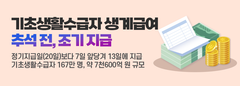 생계급여는 관련법령*에 따라 매월 20일(토요일이거나 공휴일인 경우에는 그 전날) 지급하는 것이 원칙이다. 그러나 이번 9월은 급여일 직전 추석 연휴기간(14~18일)이 있어 제수품 등 소비지출 증가로 인한 수급자들의 부담이 예상됨에 따라, 생계가 어려운 기초생활보장 수급자들의 부담을 덜고, 훈훈한 명절을 보낼 수 있도록 생계급여를 7일 앞당겨 13일에 지급하기로 했다.