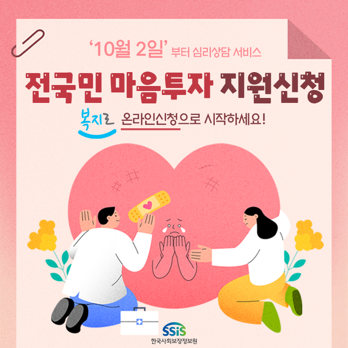 '10월 2일'부터 심리상담 서비스 전국민 마음투자 지원신청 복지로 온라인신청으로 시작하세요!