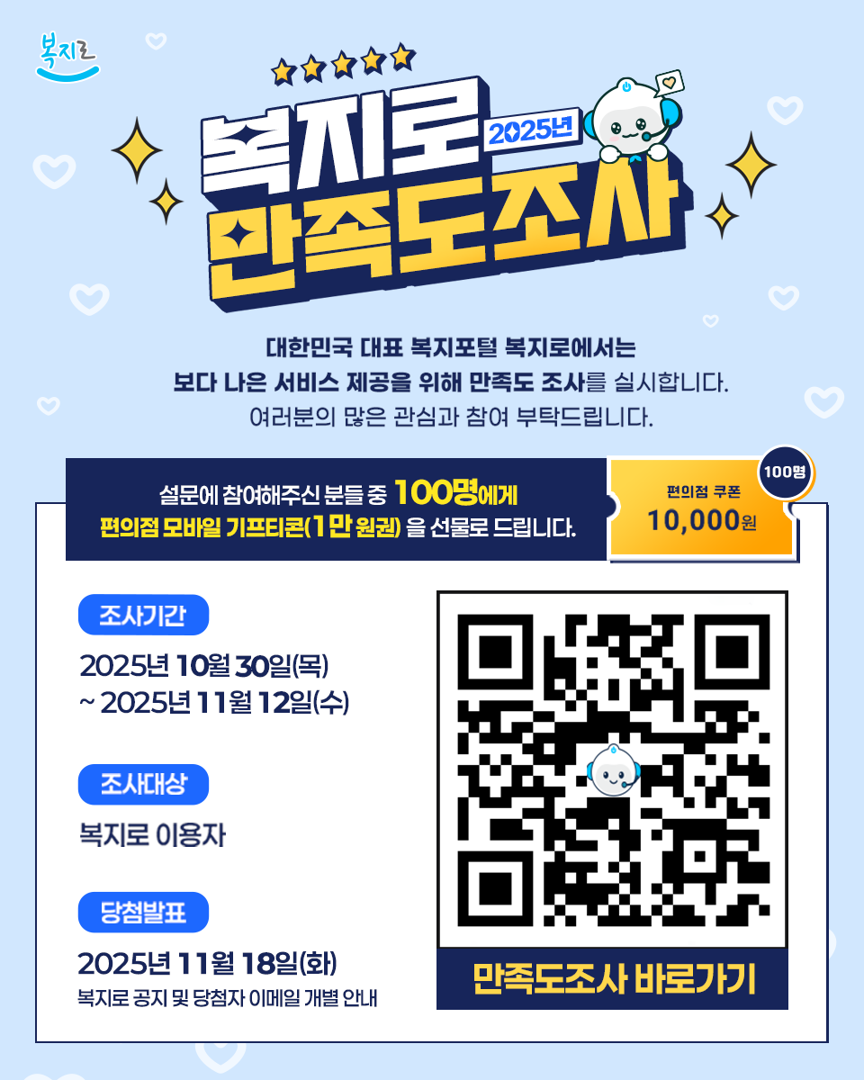| [당첨자 발표] 2025년 복지로 만족도 조사 당첨자 안내 (0) | 2025.11.18 |