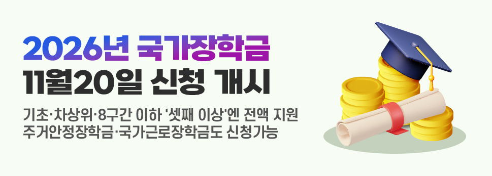 교육부(장관 최교진)와 한국장학재단(이사장 배병일, 이하 재단)은 11월 20일(목) 9시부터 12월 26일(목) 18시까지 2026학년도 1학기 1차 국가장학금 신청을 받는다.