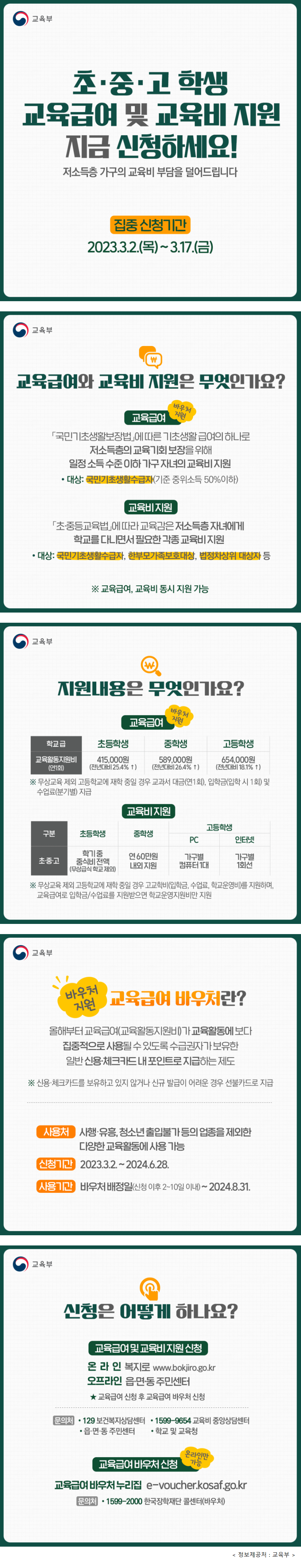 초·중·고학생 교육급여 및 교육비 지원 신청 안내 저소득층 가구의 교육비 부담을 덜어드리는 초·중·고학생 교육급여 및 교육비 지원에 대해 안내드립니다. 보다 자세한 내용은 아래 카드뉴스를 참고하여 주시기 바랍니다. 출처 : 교육부 교육급여바우처 바로가기 복지소식/홍보소식 2023.03.14