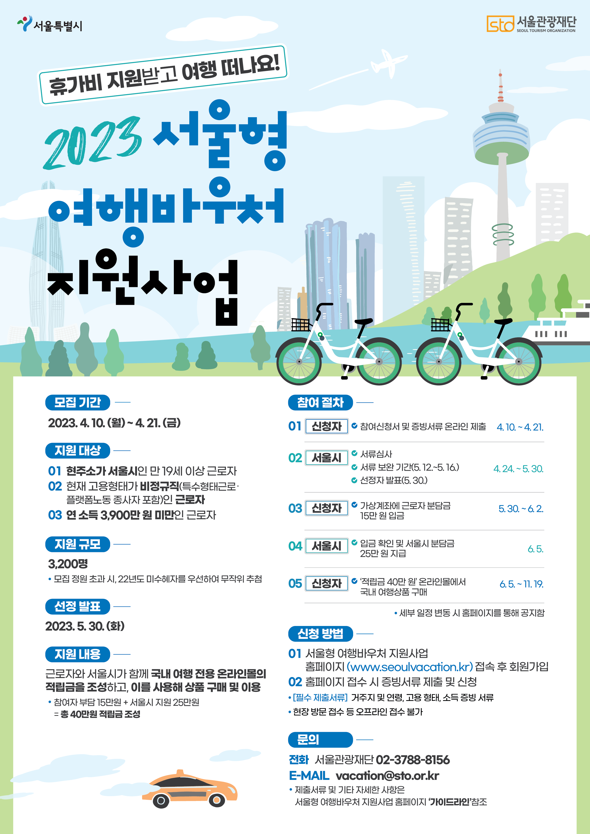 비정규직 근로자·특수형태근로종사자에게 휴가비를 지원하 ‘서울형 여행바우처 지원’ 사업 참여자를 모집합니다. ‘서울형 여행바우처 지원’ 사업이란? 상대적으로 휴가 여건이 열악한 비정규직 및 특수형태근로·플랫폼 노동종사자에게 휴가비를 지원하는 제도로, 시민의 여가 활동을 증진하고 국내관광 활성화를 위해 2019년부터 지속 추진 중인 사업입니다. [모집기간] 2023.04.10.(월) ~ 04.21.(금) [지원대상] 1. 현주소가 서울시인 만 19세 이상 근로자 2. 현재 고용형태가 비정규직(특수형태근로. 플랫폼노동 종사자 포함)인 근로자 3. 연 소득 3900만 원 미만인 근로자 [지원규모] 3,200명 *모집 정원 초과 시, 22년도 미수혜자를 우선하여 무작위 추첨 [선정발표] 2023.05.30(화) ..