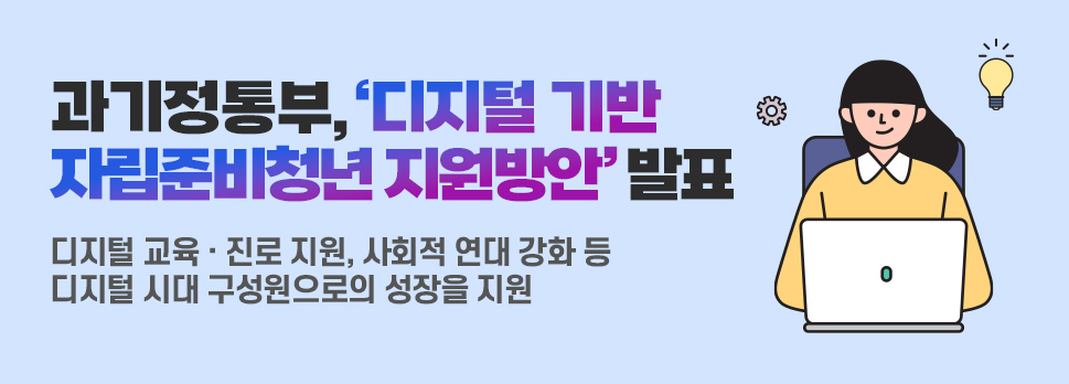 디지털 교육·진로 지원, 사회적 연대 강화 등 디지털 시대 구성원으로의 성장을 지원 과학기술정보통신부 (장관 이종호, 이하 ‘과기정통부’)는 정보문화의 달을 맞아 사회관계장관회의에서 「디지털 기반 자립준비청년 지원방안」 을 발표했습니다. 제4차 산업혁명, 디지털 대전환 등 대규모 사회·경제 변화에 따라 디지털 자유, 디지털 보편권이 중요해지는 가운데, 보호대상아동과 자립준비청년이 디지털 시대를 열어가는 구성원으로 성장할 수 있도록 지원하기 위해 마련되었습니다. 자립준비청년은 아동복지시설, 가정위탁 등의 보호를 받다가 만 18세*가 되어 사회로 홀로 나서는 청소년으로 연 2,000명 가량이 자립을 시작하고 있으나, 사회적 지지체계의 부족으로 교육, 취업, 정서 등 여러 측면에서 홀로서기에 어려움을 겪고 있..
