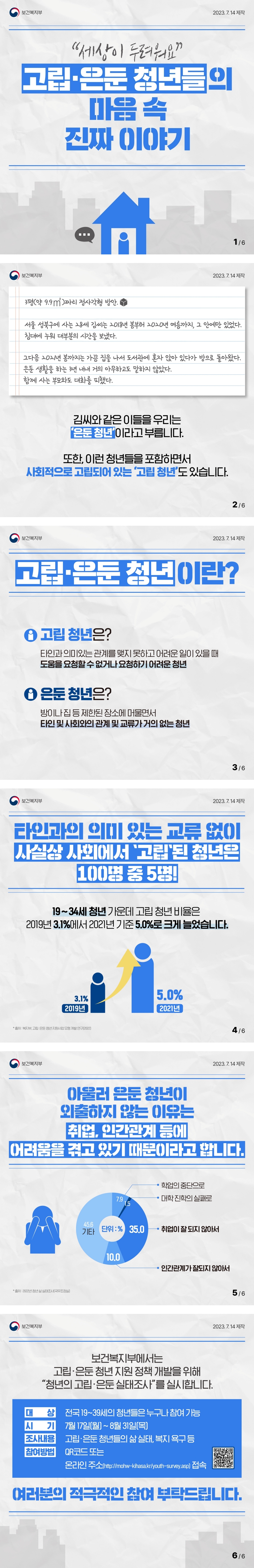 돌봄필요 중장년, 가족돌봄 청년 대상 돌봄, 동행 및 심리지원 등 통합 제공 보건복지부(장관 조규홍)는 올해 하반기부터 질병, 고립 등으로 돌봄이 필요한 중장년과 가족돌봄청년에게 일상돌봄 서비스를 제공한다고 밝혔습니다. 일상돌봄 서비스란 질병, 부상, 고립 등으로 혼자 일상생활을 수행하기 어려우나 가족, 친지 등에 의해 돌봄을 받기 어려운 중장년(만 40~64세)과 돌봄이 필요한 가족을 돌보거나 이로 인해 생계 책임을 지고 있는 소위 영케어러, 가족돌봄청년(청소년 포함, 만 13~34세)에게 돌봄·가사, 병원 동행, 심리지원 등을 통합 제공하여 일상생활의 어려움을 해소하는 서비스입니다. * 대상자의 연령 등 세부기준은 지역에 따라 조정될 수 있음 노인장기요양, 장애인활동지원 및 아이돌봄 등 기존 돌봄 서..