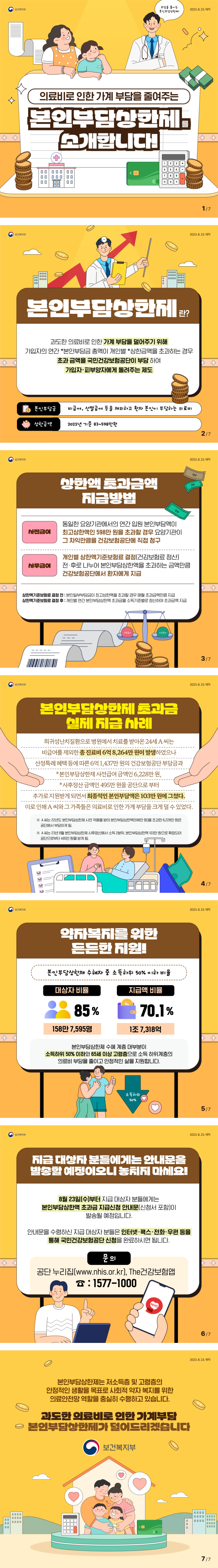 과도한 의료비로 인한 가계 부담을 덜어 드리는 본인부담상한제를 소개합니다. 본인부담상한제란? 과도한 의료비로 인한 부담을 덜어드리기 위해 가입자의 연간 본인부담금 총액이 상한금액을 초과하는 경우 초과된 금액을 국민건강보험공단이 부담하여 가입자 또는 피부양자에게 돌려드리는 제도입니다. 신청 방법 및 지급 관련 내용을 아래의 카드뉴스와 링크에서 알아보세요. 출처 : 보건복지부 국민건강보험공단 바로가기