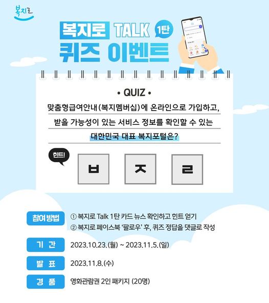 복지로 Talk ‘맞춤형급여안내(복지멤버십)’ 카드뉴스를 확인하고 퀴즈를 풀어보세요. 추첨을 통해 총 20명에게 영화관람권을 드립니다. 맞춤형급여안내(복지멤버십)에 온라인으로 가입하고, 받을 가능성이 있는 서비스 정보를 확인할 수 있는 대한민국 대표 복지포털은 무엇일까요? [이벤트 참여방법] ① 복지로 Talk 1탄 ‘맞춤형급여안내(복지멤버십)’ 아래 카드 뉴스 확인하고 힌트 얻기 ▶ PC 버전 https://url.kr/hcb4yw ▶ Mobile 버전 https://url.kr/e79dn8 ② 복지로 페이스북 ‘팔로우’ 후, 퀴즈 정답을 댓글로 작성 ▸이벤트 기간: 2023.10.23.(월) ~ 2023.11.5.(일) ▸당첨자 발표: 2023.11.8.(수) ▸이벤트 경품: 영화관람권 2인 패키지 ..