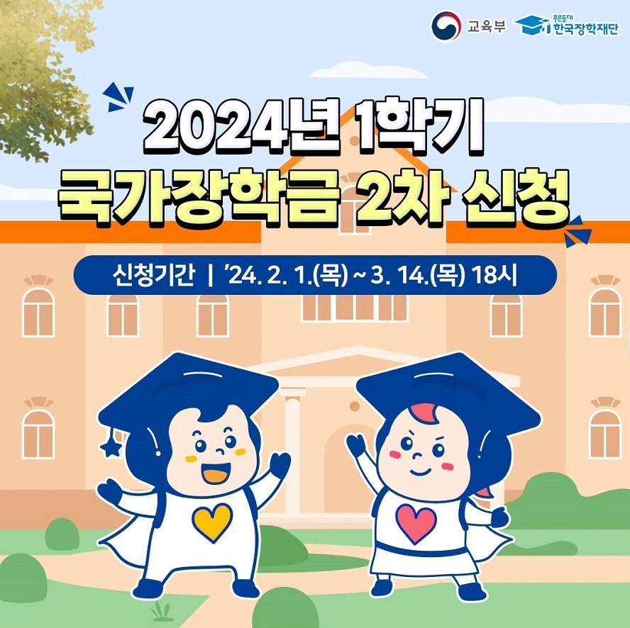 2024년 1학기 국가장학금 2차 신청 대학생들의 등록금 부담을 덜어주고 학업에 열중할 수 있도록 하는 국가장학금 2024년 1학기 2차 신청이 '24.2.1(목) ~3.14(목) 18시까지 진행됩니다. 신청 대상, 지원금액, 신청방법을 아래 카드뉴스에서 확인해 보세요. 출처 : 교육부, 한국장학재단 한국장학재단 누리집 바로가기 복지소식/홍보소식 2024.02.06