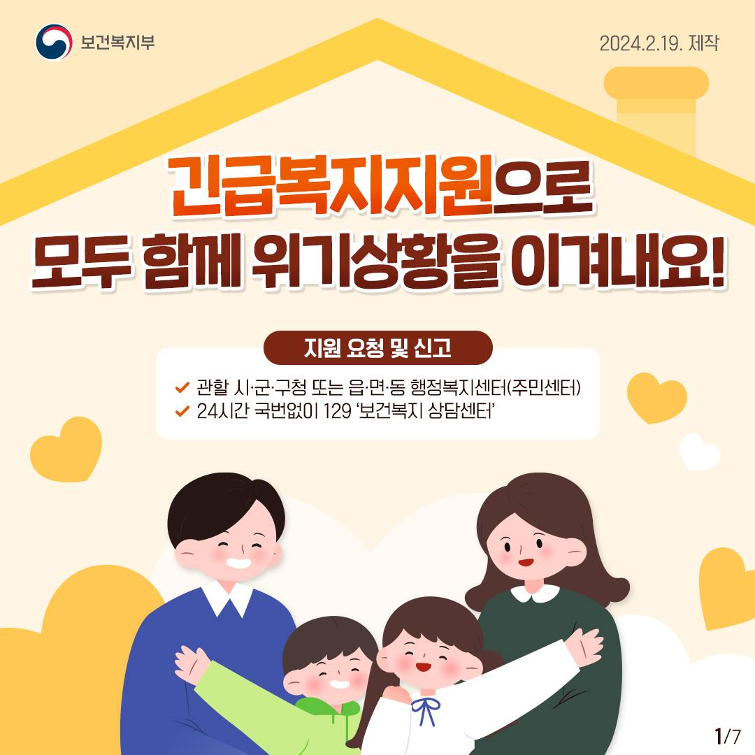 갑작스러운 위기상황에 놓여 도움이 필요하신가요? 긴급복지지원을 통해 위기상황에 처하여 도움이 필요한 사람을 신속하게 단기적으로 지원합니다. ✔ 지원대상 : 위기사유 발생으로 생계유지가 곤란한 저소득층 ✔ 지원내용 : 생계지원, 의료지원, 주거지원, 사회복지시설 이용지원 ✔ 부가지원 : 교육지원, 그 밖의 지원(연료비, 해산비, 장제비, 전기요금) ✔ 지원요청 : 거주지 관할 시군구청 또는 행정복지센터, 보건복지상담센터 (국번없이 129) 아래의 카드뉴스에서 자세한 내용을 알아보세요! 출처 : 보건복지부