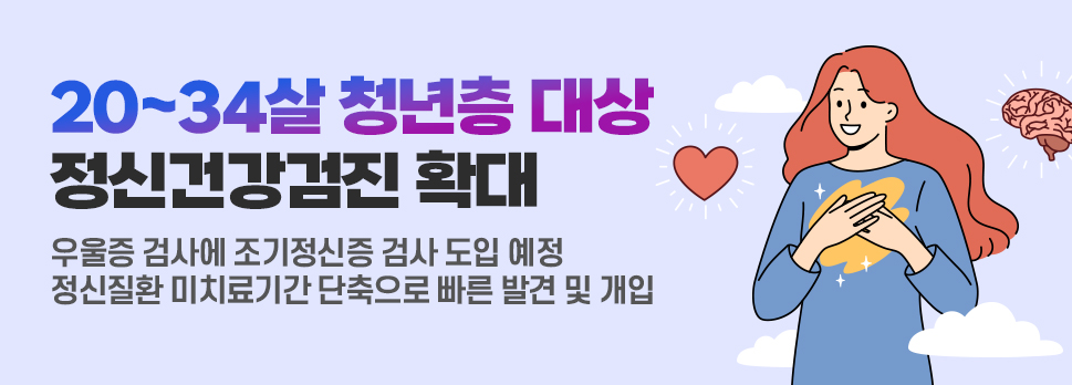 - 2024년 제3차 국가건강검진위원회 개최 -- 청년 정신검진주기 10년에서 2년으로 단축 및 조기정신증 항목 도입- 보건복지부(장관 조규홍)는 10월 17일(목) 2024년 제3차 국가건강검진위원회를 개최하여 일반건강검진 내 정신건강검사 확대(안)을 심의하고 그 결과를 공개하였다. 이날 위원회에서는 중증 정신질환이 주로 초발하는 청년기*에 주기적인 정신건강검진을 통해 질병을 조기에 발견하고 만성화를 예방하고자 청년(20~34세) 대상 정신건강검사를 확대하는 방안을 의결하였다. * 우울장애, 조현병스펙트럼, 양극성장애 등 주요 정신질환의 발병 중위연령이 20~30대 현행 일반건강검진 내 우울증검사는 10년 주기로 실시 중이나, 내년부터 20~34세의 청년들은 2년 주기로 일반건강검진을 받을 때마..