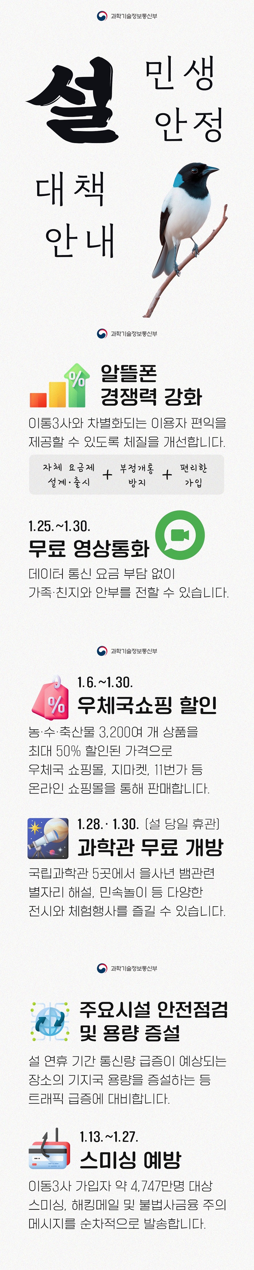 설 민생 안정 대책에 대해 안내드립니다. 자세한 사항은 아래 카드뉴스를 통해 확인해 주세요. 출처 : 과학기술정보통신부  ▼ 또 다른 복지로를 소개합니다 ▼