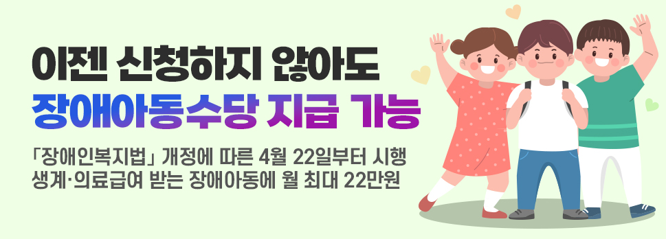 「장애인복지법」 개정에 따른 4월 22일부터 시행생계·의료급여 받는 장애아동에 월 최대 22만원 보건복지부(장관 조규홍)는 개정된 「장애인복지법」에 따라 2025년 4월 22일 이후부터 기초생활보장 생계급여 또는 의료급여를 받는 등록 장애아동에게는 장애아동수당을 의무적으로 지급한다고 밝혔다. 이에 생계·의료급여를 받는 장애아동이라면 별도로 신청하지 않아도 월 최대 22만 원의 장애아동수당을 자동적으로 지급받게 된다. 장애아동수당은 의료비, 교육비 등 장애아동의 장애로 인한 추가 비용을 지원하기 위한 현금 급여로, 18세 미만의(「초·중등교육법」제2조에 따른 학교에 재학 중인 경우 20세 이하까지 포함) 등록 장애아동 중 국민기초생활보장 수급자 및 차상위계층을 대상으로 장애 정도와 소득 계층에 따라 ..