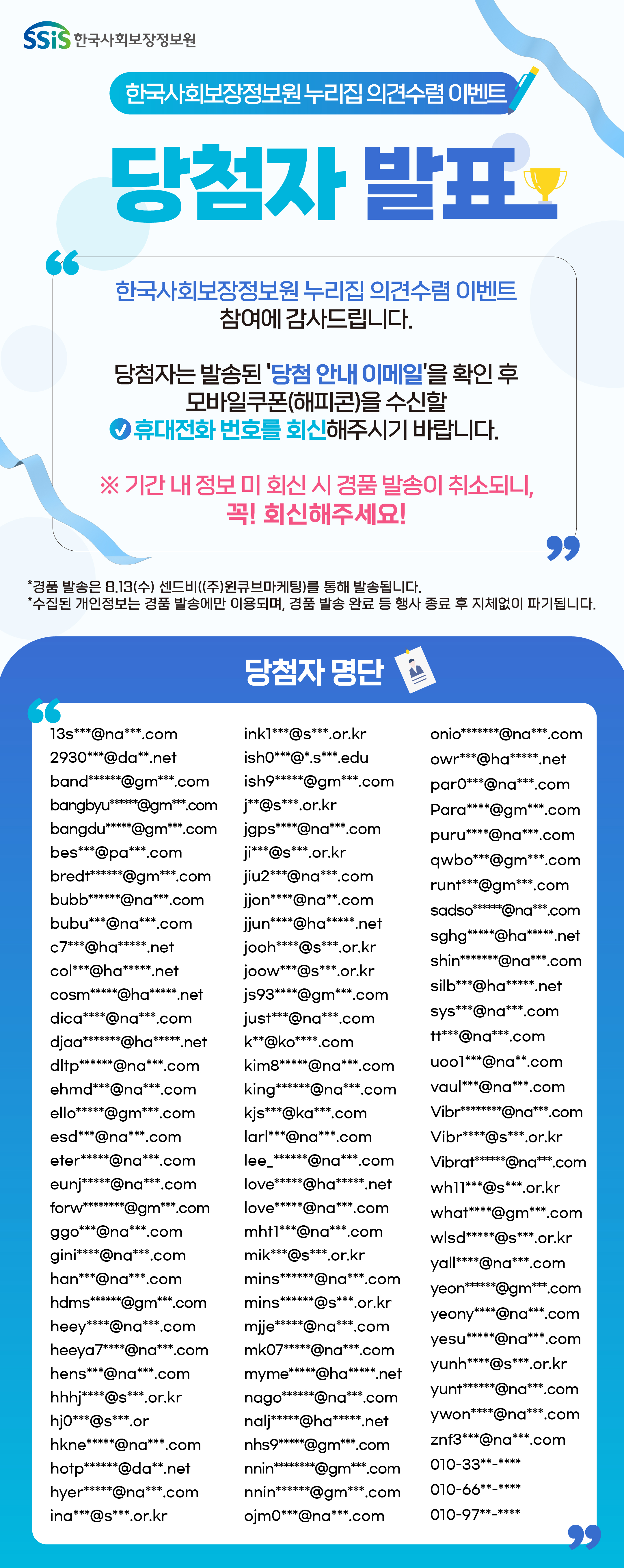 ✨ 2025 복지로 만족도 조사 ✨여러분의 의견이 더 나은 복지로를 만듭니다💙복지 서비스를 이용하시면서 느낀 점을 들려주세요!🗓 조사기간: 2025.10.30(목) ~ 11.12(수) 👥 조사대상: 복지로 이용자 🎁 참여이벤트: 참여자 중 100명에게 편의점 모바일 기프티콘(1만 원권)을 드립니다! 📢 당첨발표: 2025.11.18(금) 복지로 공지 및 이메일 개별 안내