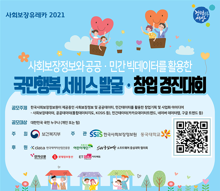 '사회보장 유레카 2021 국민행복 서비스 발굴·창업 경진대회' 개최 안내 보건복지부와 한국사회보장정보원·동국대학교에서 사회보장정보와 공공·민간 빅데이터를 활용한 국민행복 서비스 발굴·창업 경진대회를 개최합니다. (공모 기간 : 2021년 4월 5일 ~ 5월 31일) 보다 자세한 사항은 아래 링크 및 포스터를 참고하시기 바랍니다. - 출처 : 한국사회보장정보원 경진대회 자세한 안내 바로가기 공지사항 & 이벤트 2021.04.06