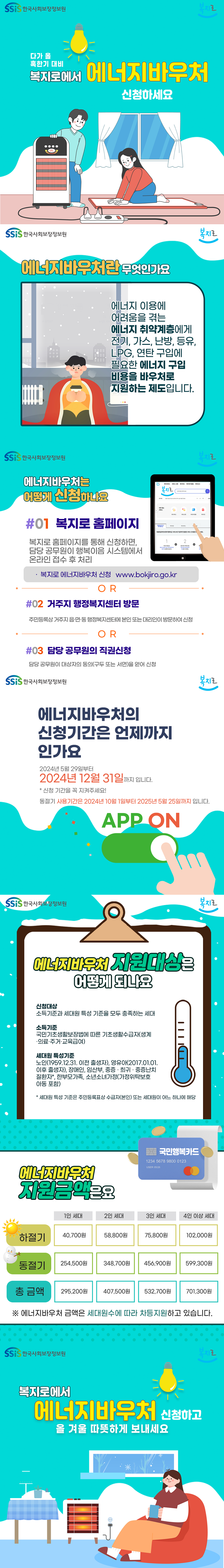 다가올 혹한기 대비 복지로-에너지바우처 신청 안내 복지로 에너지바우처 신청에 대해 알려드립니다. 자세한 사항은 아래 카드뉴스를 통해 확인해 주세요. 출처 : 한국사회보장정보원 ▼ 또 다른 복지로를 소개합니다 ▼ 복지소식/홍보소식 2024.11.21
