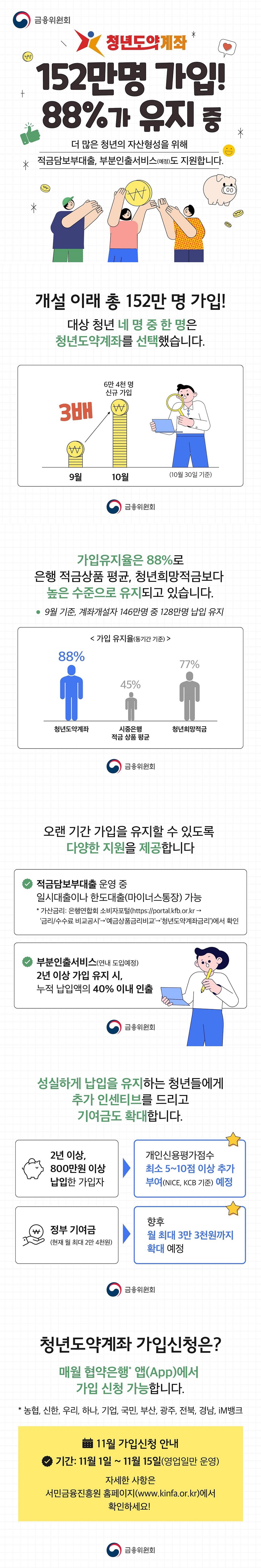청년도약계좌 가입자 88% 유지 중 청년도약계좌 가입을 유지할 수 있도록 다양한 지원을 제공합니다. 자세한 사항은 아래 카드뉴스를 통해 확인해 주세요. 출처 : 금융위원회 ▼ 또 다른 복지로를 소개합니다 ▼ 복지소식/홍보소식 2024.11.18