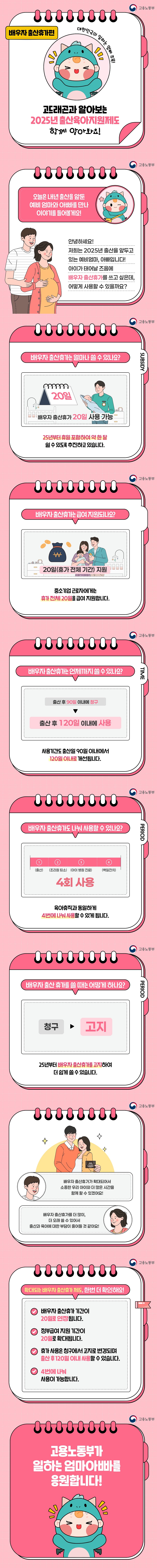 2025년 출산육아지원제도 배우자 출산휴가편 배우자 출산휴가에 대해 알려드립니다. 자세한 사항은 아래 카드뉴스를 통해 확인해 주세요. 출처 : 고용노동부 ▼ 또 다른 복지로를 소개합니다 ▼ 복지소식/홍보소식 2024.11.13