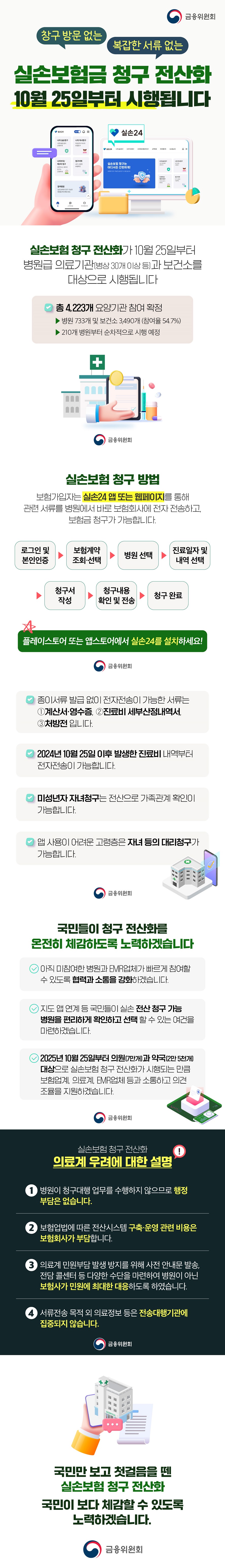 10월 25일부터 실손보험금 청구 전산화 실손보험 청구 전산화가 10월 25일부터 시행됩니다. 자세한 사항은 아래 카드뉴스를 통해 확인해 주세요.😊 출처 : 금융위원회 ▼ 또 다른 복지로를 소개합니다 ▼ 복지소식/홍보소식 2024.11.05