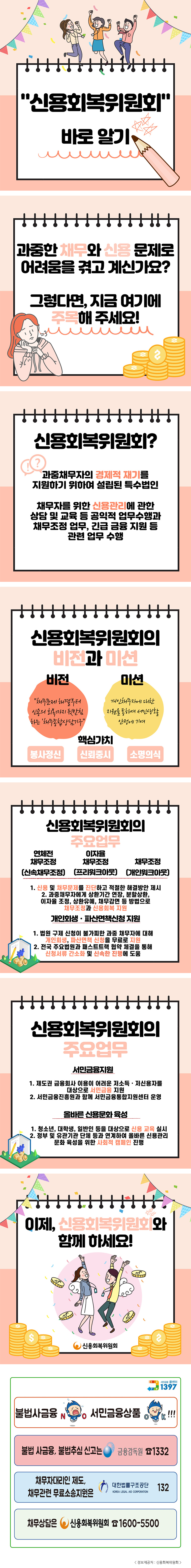 신용회복위원회 채무조정제도 포스터 신용회복위원회에서는 과중한 채무와 신용문제로 고통받는 채무자의 신용회복과 경제적 재기를 지원하고 있습니다. 보다 자세한 사항은 아래 포스터 및 링크를 참고하시기 바랍니다. - 출처: 신용회복위원회 신용회복위원회 홈페이지 바로가기 복지소식/홍보소식 2021.05.24