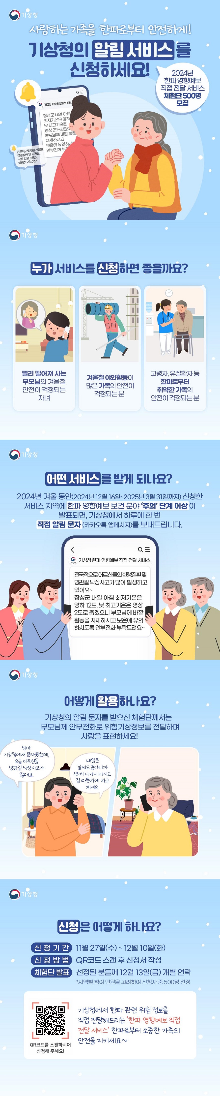 기상청 ‘한파 영향 예보 직접 전달 서비스’ 신청하세요! 기상청 ‘한파 영향예보 직접 전달 서비스’에 대해 안내드립니다. 자세한 사항은 아래 카드뉴스를 통해 확인해 주세요.😊 출처 : 기상청 ▼ 또 다른 복지로를 소개합니다 ▼ 복지소식/홍보소식 2024.12.17