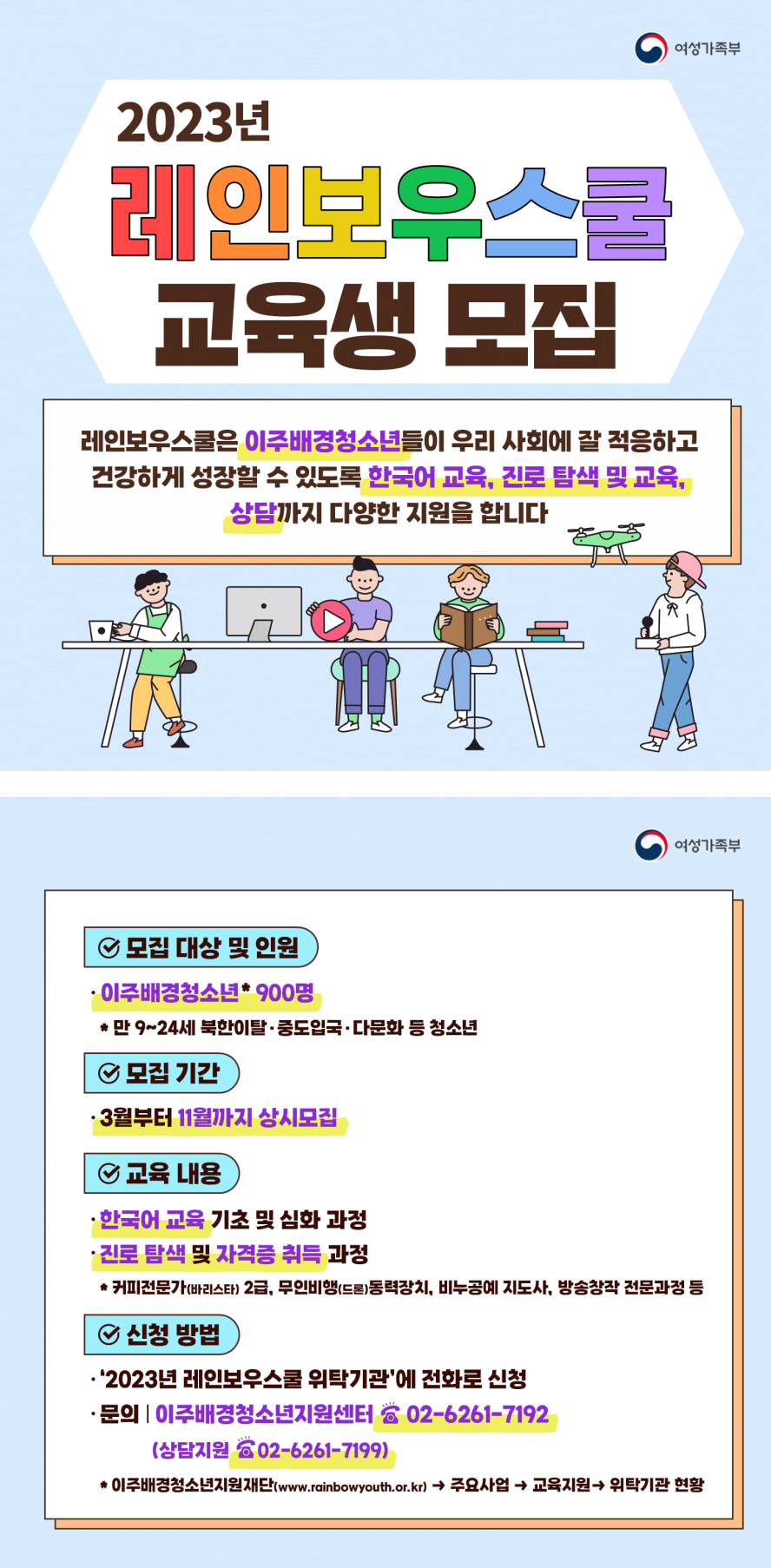 레인보우스쿨 교육생 모집 안내 이주배경청소년들이 우리사회에 잘 적응하고 건강하게 성장할 수 있도록 한국어 교육, 진로 탐색 및 교육, 상담까지 다양한 지원을 하는 레인보우스쿨에 대해 안내해드립니다. [ 모집 대상 및 인원 ] 이주배경청소년 900명 [ 모집기간 ] 23.3월부터 11월까지 상시모집 [ 교육내용 ] 한국어 교육 기초 및 심화과정 진로탐색 및 자격증 취득 과정 [ 신청방법 ] 복지소식/홍보소식 2023.04.17