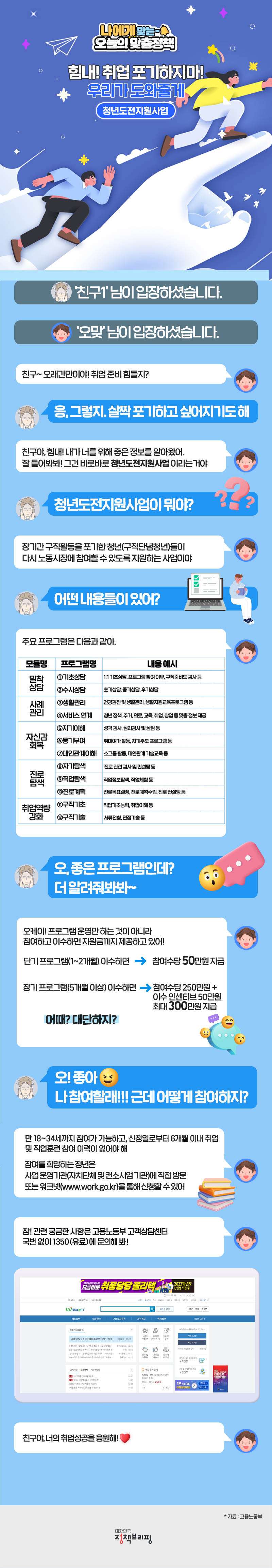 - 2023년 고용노동부 지원사업 및 제도 안내 책자 - 고용노동부는 2023년에 시행하는 각종 지원사업과 제도를 한 권에 집약한 『2023 한 권으로 통(通)하는 고용노동 정책』을 2.16. 발간했습니다. 동 책자는 근로자, 구직자, 사업주 등이 고용노동부의 사업 및 제도를 한눈에 이해하고 활용할 수 있도록 돕기 위해 2012년부터 매년 발간해 왔습니다. 특히, 2023년 발간본은 각종 지원사업 및 제도를 정책방향과 내용에 맞게 11개 분야(Contents), 총 170개 사업으로 개편하였습니다. ① 취업 취약계층 고용안정ㆍ취업지원(42개), ② 외국인력 제도 운영ㆍ지원(7개) ③ 맟춤형 취업 및 채용지원 서비스(8개), ④ 사업주 지원 장려금(22개) ⑤ 두터운 고용안전망 구축(11개), ⑥ 자율ㆍ창..