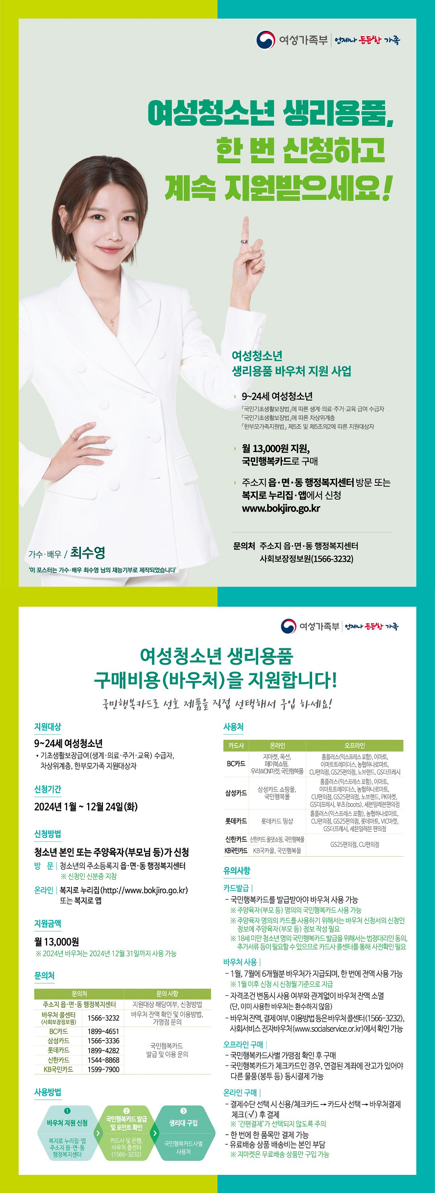 ✅ 지원대상 : 9~24세 여성청소년 (기초생활보장급여 수급자, 차상위계층, 한부모가족 지원대상자)