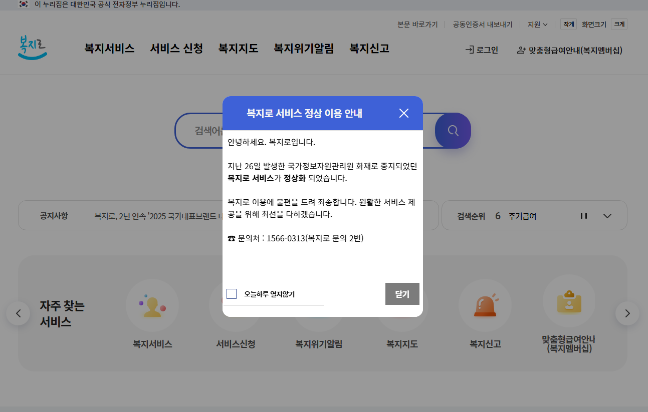 지난 26일 발생한 국가정보관리원 환재로 중지되었던 복지로 서비스가