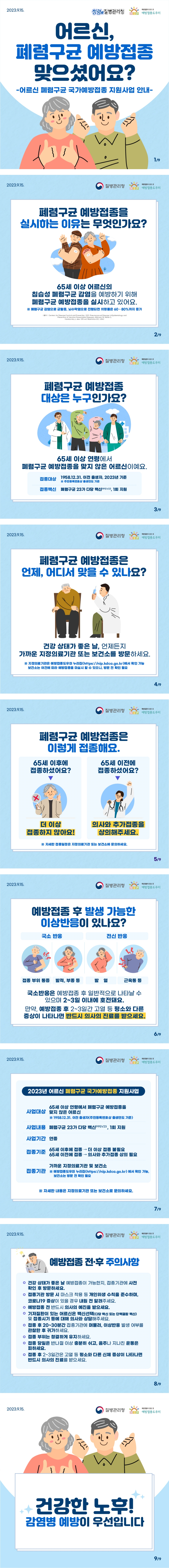 어르신 폐렴구균 국가예방접종 지원사업 안내 65세 이상 어르신의 침습성 폐렴구균 감염을 예방하기 위해 폐렴구균 예방접종을 실시합니다. 아래의 카드뉴스에서 접종 관련 내용을 확인해 보세요. 복지소식/홍보소식 2023.10.25