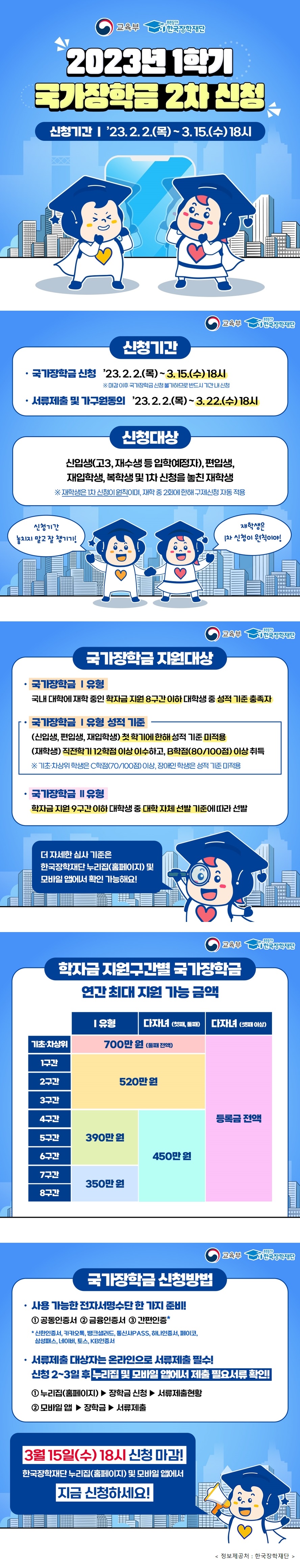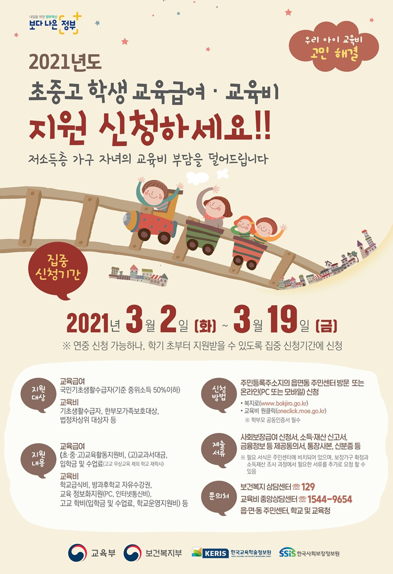 ◈ 집중신청기간: 3월 2일(화)~19일(금) - (방법) 누리집(복지로 등) 또는 해당 지역 행정복지센터 방문신청 - (대상) 저소득층 초중고 학생(기초생활수급자, 한부모가정, 법정차상위 등) ◈ 교육급여 지원 금액, 작년 대비 평균 24% 인상 지원 교육부(부총리 겸 교육부장관 유은혜)는 저소득층 학생의 실질적 교육기회 보장과 학부모의 교육비 부담 경감을 위해, ‘교육급여 및 교육비 지원’ 집중신청기간을 3월 2일(화)부터 19일(금)까지 운영합니다. 교육급여는 기초생활보장제도의 하나로 전국의 지원 기준이 같고, 교육비 지원은 시도교육청의 예산에 맞추어 지원하는 사업으로 시도별로 지원 기준을 마련하여 시행합니다. 지원을 희망하는 학부모(보호자)는 주소지의 읍·면·동 행정복지센터를 방문하거나 누리집*에..