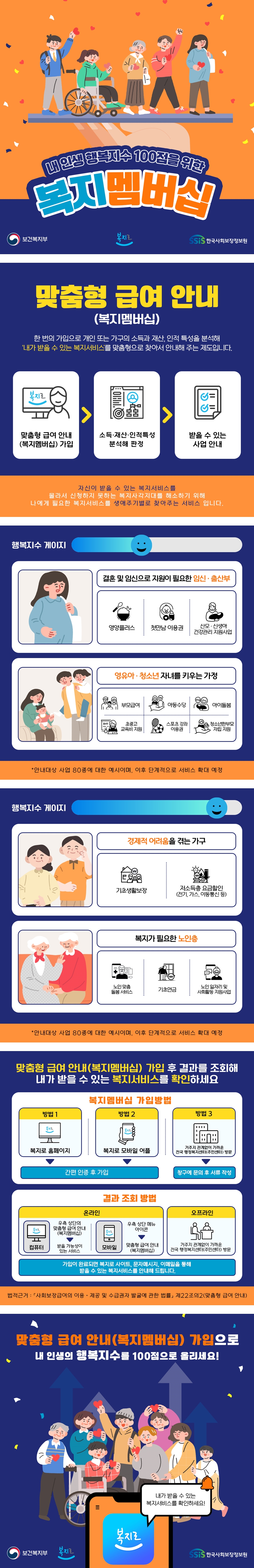 나에게 필요한 복지서비스를 생애주기별로 찾아주는 '맞춤형급여안내(복지멤버십)' 가입으로 내 인생의 행복지수를 100점으로 올리세요! 맞춤형 급여 안내(복지멤버십)는 한 번의 가입으로 개인 또는 가구의 소득과 재산, 인적 특성을 분석해 "내가 받을 수 있는 복지서비스"를 맞춤형으로 찾아서 안내해 주는 제도 지금 복지멤버십에 가입해 내가 받을 수 있는 복지서비스를 확인해 보세요! 복지멤버십 가입방법 1. 복지로 홈페이지를 통해 간편 인증 후 가입 2. 복지로 모바일 앱을 통해 간편 인증 후 가입 3. 가까운 전국 행정복지센터(주민센터) 방문 본문의 카드뉴스와 링크에서 관련 내용을 알아보시고, 상단의 첨부파일 내 포스터와 리플릿도 참고해 보세요!