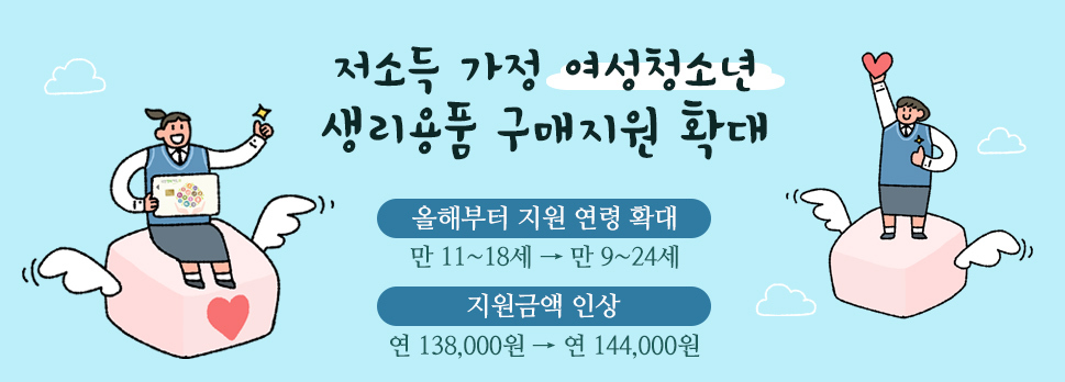 취약계층 여성청소년 대상 생리용품 지원을 통해 여성청소년의 건강한 성장을 지원합니다. ✅ 지원대상 : 9~24세 여성청소년 (기초생활보장급여 수급자, 차상위계층, 한부모가족 지원대상자) ✅ 신청 기간 : 2024년 1월 ~ 12월 24일(화) ✅ 지원 금액 : 월 13,000원 ✅ 신청 방법 : 주소지 읍면동 행정복지센터 방문 또는 복지로 누리집(http://www.bokjiro.go.kr)·앱 아래의 포스터에서 관련 내용 알아보세요😀 출처 : 여성가족부