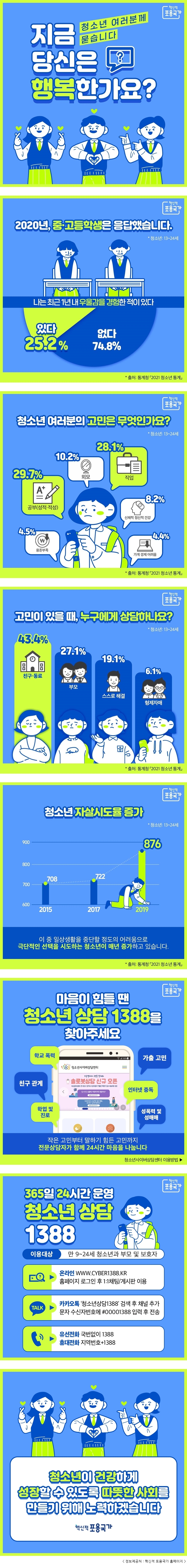 청소년의 걱정·고민상담, 「1388」을 기억하세요! ‘청소년상담1388’ 전화와 문자 상담번호가 「1388」로 통일되었습니다. 간편해진 문자상담 번호로 더 편하게 청소년 관련 고민을 나눠보실 수 있습니다. - 출처 : 여성가족부 복지소식/홍보소식 2022.02.10