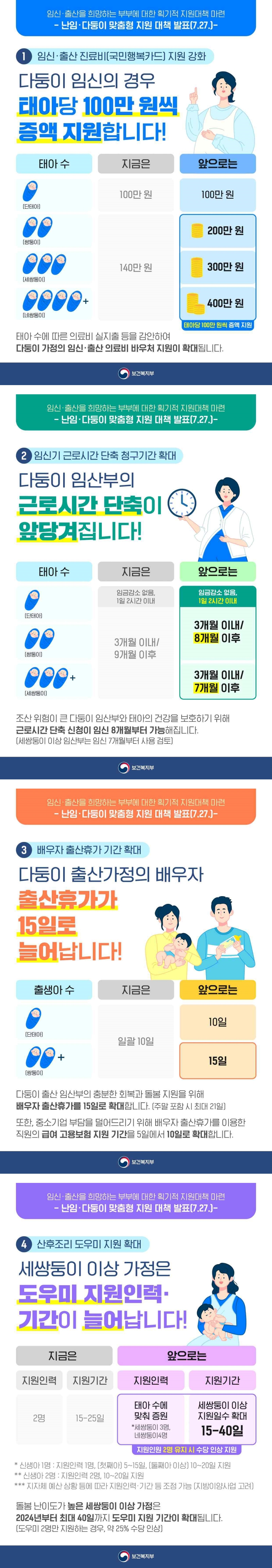 대폭 인상된 부모급여로 양육부담은 확 덜고 함께하는 시간은 늘리세요 2024년부터 0세 100만 원, 1세 50만 원으로 부모급여 인상 올해 1월부터 영아를 키우는 가정의 경제적 부담을 덜어드릴 수 있도록 부모급여 지원금액을 대폭 인상하여 지원한다. 이에 따라 0세(0~11개월)인 아동의 가정은 월 100만 원을, 1세(12~23개월)인 아동은 월 50만 원의 부모급여를 받게 된다.(기존 0세 월 70만 원, 1세 월 35만 원) 부모급여는 읍‧면‧동 행정복지센터에 방문 신청하거나 복지로 또는 정부24 누리집(홈페이지)을 통해 온라인으로 신청 가능하다. 또한, 행복출산 원스톱서비스를 통해 출생신고와 함께 부모급여를 신청할 수도 있다. 어린이집을 다니거나 종일제 돌봄서비스를 이용할 때, 바우..