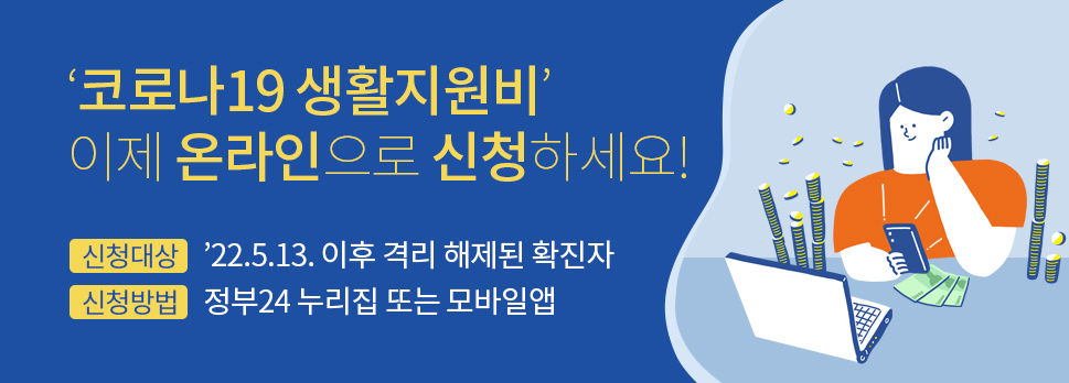 - 2022.5.13.이후 격리 해제된 확진자 대상으로 온라인신청 서비스 개시- - 5.12.이전 격리 해제된 확진자는 종전대로 읍면동 방문, 우편, 전자우편 신청- □ 코로나19 확진으로 인한 입원 또는 격리 시 지원하는 생활지원비를 5월 13일(금)부터 정부24(www.gov.kr)에서 온라인으로 신청할 수 있게 됩니다. □ 행정안전부와 질병관리청은 5월 13일(금)부터 정부24 누리집 또는 모바일앱을 통해 코로나19 확진자에 대한 ‘생활지원비 신청 온라인 서비스’를 개시한다고 밝혔습니다. ○ 생활지원비는 코로나19 입원․격리자 중 유급휴가를 제공받지 못한 격리자에게 지급하는 지원금으로 그동안 읍․면․동을 직접 방문하거나 우편, 전자우편 등을 통해 신청할 수 있었습니다. □ 5월 13일(금), 서비스..