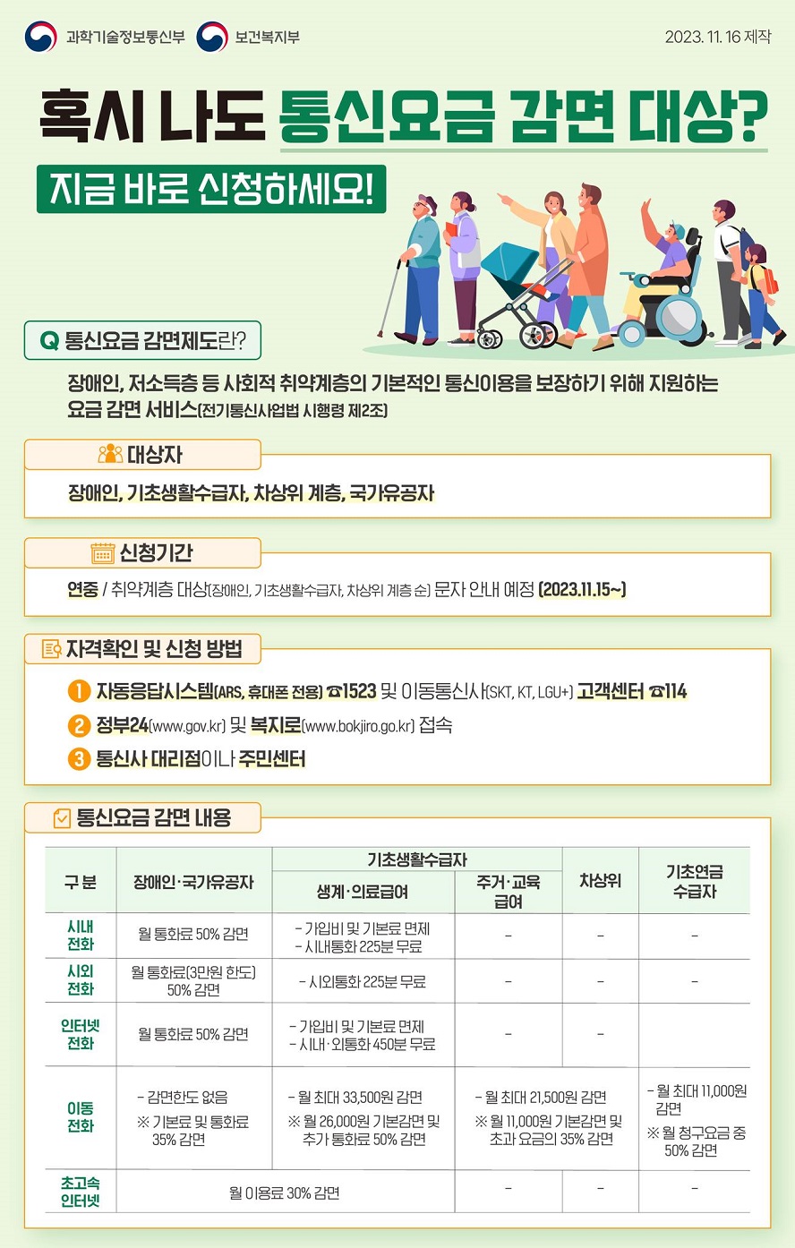 통신요금 감면 제도 안내 사회적 취약계층을 대상으로 통신요금을 지원합니다. 아래의 이미지와 링크에서 관련 내용을 자세히 알아보세요! 출처 : 과학기술정보통신부, 보건복지부 이통통신요금감면 서비스 온라인신청 바로가기 복지소식/홍보소식 2023.11.21