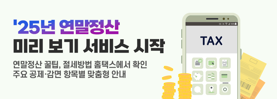 ✅ ’25년 귀속 연말정산 미리보기 서비스 11.5. 개통, 맞춤형 사전안내 11.6. 제공 - 국세청(청장 임광현)은 13월의 월급을 기대하는 2천만 근로자를 위해 「연말정산 미리보기」 서비스를 11. 5.(수) 개통하고, 주요 공제·감면 항목별 「맞춤형 안내」 서비스도 11.6.(목) 부터 내년 1.31.까지 제공합니다. 「연말정산 미리보기」에서는 ’25년 1∼ 9월간 신용·체크카드 등 사용액과 지난 연말정산 때 신고한 공제 금액을 이용하여 ’26.1월 연말정산 예상세액을 계산해보고, 연말 소비·저축 계획을 알뜰히 세워볼 수 있습니다. 결혼·출산 등으로 인한 부양가족 변경과 총급여·교육비·의료비 등 소득·지출 변동이 연말정산 세액에 미치는 영향까지 미리 알아볼 수 있습니다. 또한 익숙하지 않은 공제..